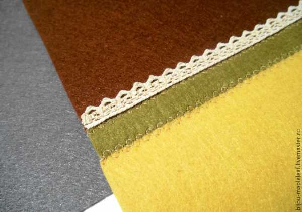 Приступаем к работе: выкраиваем прямоугольники — 13,5 х20 см 1 шт., 5х13,5 см – 2 шт. По длинным сторонам большого прямоугольника пристрачиваем кружево или тесьму, загибая концы ленты на изнаночную сторону.