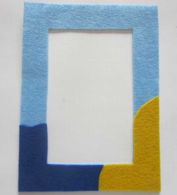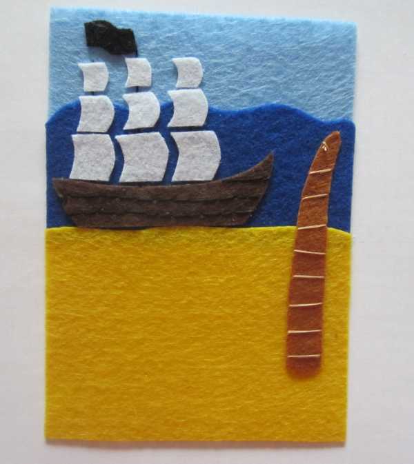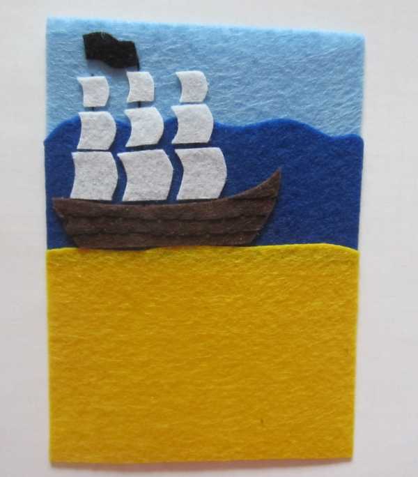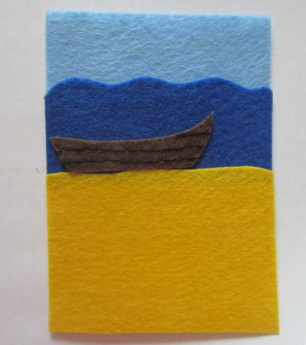 Вырезаем небо, море и сушу из кусочков цветного фетра, небо и море должны отличаться по цвету. В данном случае мы использовали для моря темно синий цвет, а для неба — светло голубой. Затем склеиваем отрезки ткани между собой так, чтобы получился прямоугольник 10×14 см.