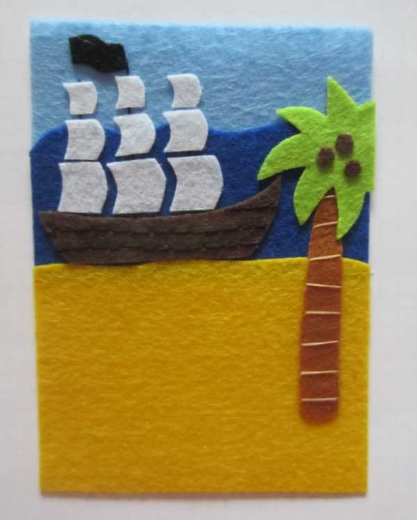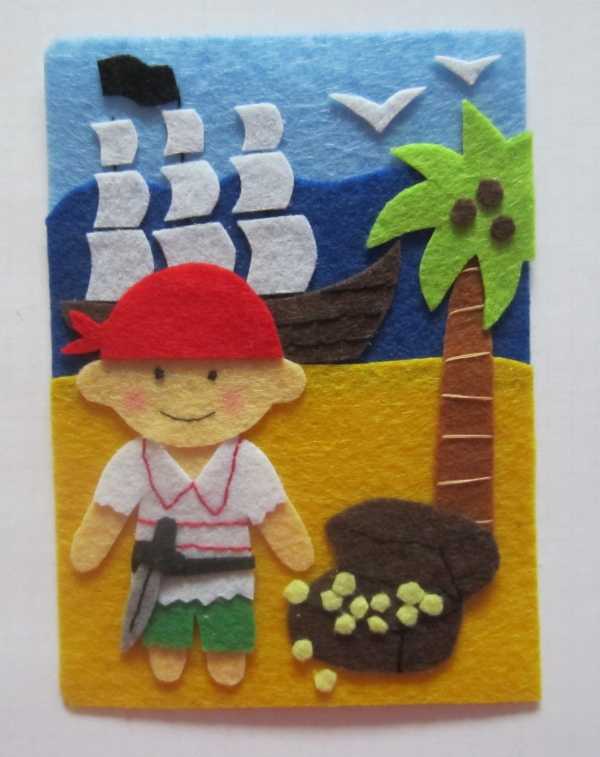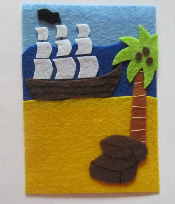 Слева приклеиваем фигуру пирата, в небе делаем чаек, внутрь сундука клеим кружочки из желтого фетра.