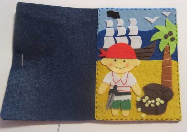 Обложка готова. С помощью лака или краски с блестками можно покрыть сокровища в сундуке, а так же украсить повязку пирату.