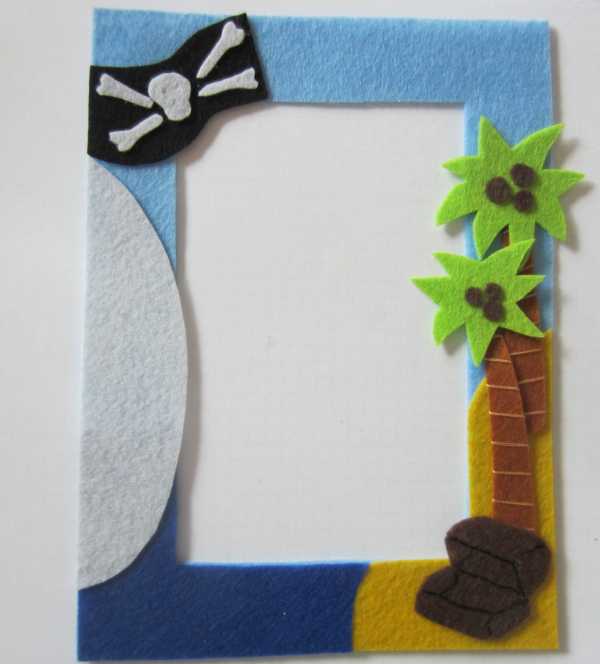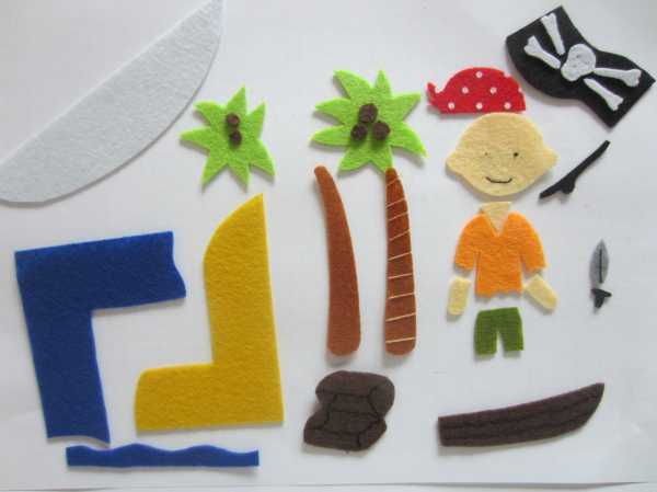Теперь из цветного фетра вырезаем детали для аппликации. Для этого увеличьте или уменьшите следующие фотографии до нужного размера, подходящего для паспорта (небо 10×3 см, море 10×5 см, суша 10×7 см, голова пирата 5×3 см, длина корабля и ствола пальмы по 7 см), и переведите с монитора на бумагу (наложите лист бумаги на монитор и обведите ручкой или карандашом)или распечатайте. Вырежьте шаблон из бумаги, а затем переведите его на фетр.