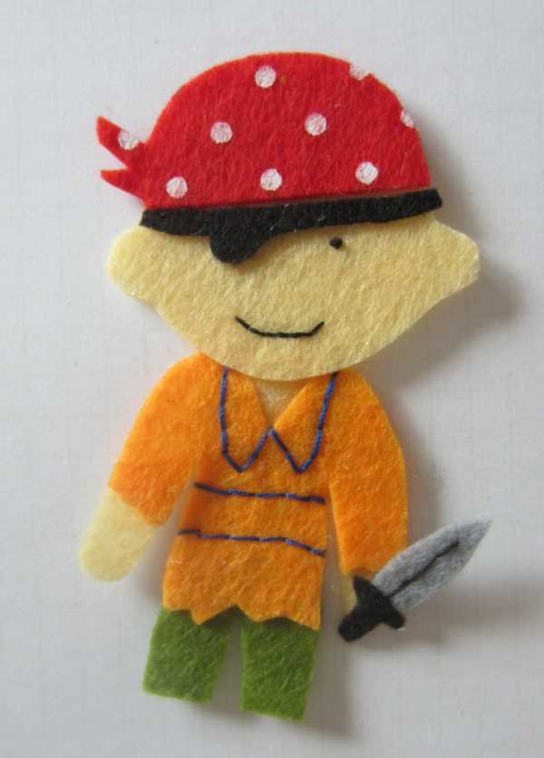 Из черного фетра делаем рукоять ножа и пояс пирата, из серого фетра вырезаем клинок, по центру лезвия и пояса делаем строчку.
