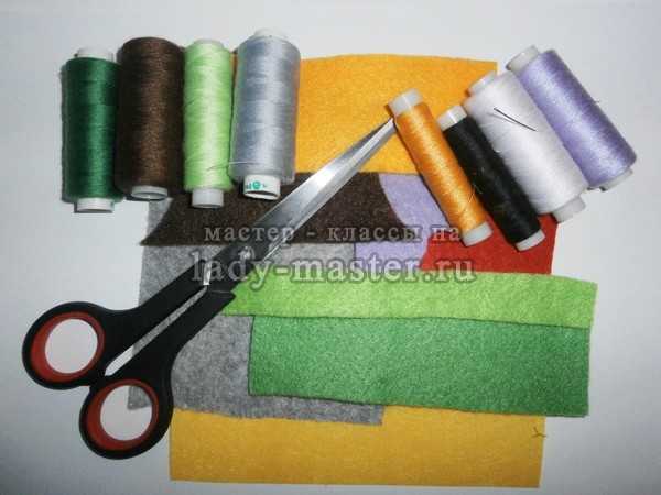 Кусок плотного однотонного фетра основного цвета, остатки желтого, зеленого, красного, голубого или другого цветного фетра, картон или плотная бумага, темно-зеленая, желтая нити-мулине, швейные нитки под цвет тканей, карандаш, портновский мелок, иголка, ножницы.
