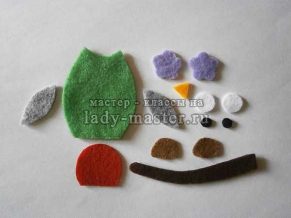 - — лоскутки фетра разных цветов – серого, красного, сиреневого, коричневого, зеленого, желтого, белого, черного;