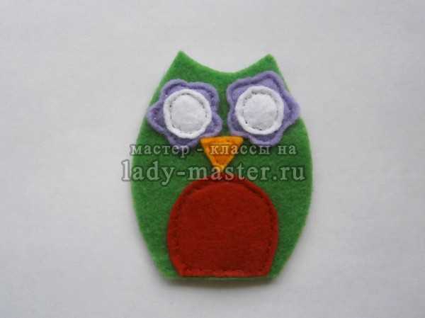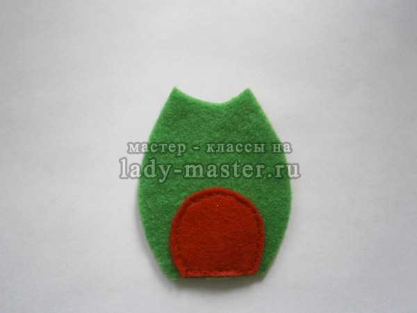 8. Возьмем фигурку совы, вырезанную из зеленого фетра, и пришьем к ней грудку, вырезанную из красного фетра.