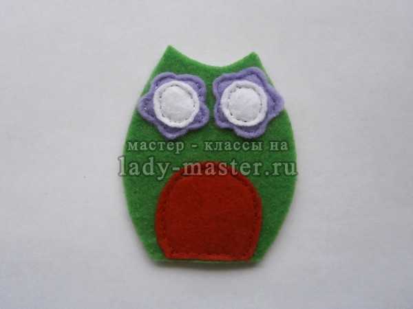 9. В верхней части фигурки совы пришьем глаза в виде цветочков, вырезанные из сиреневого фетра.