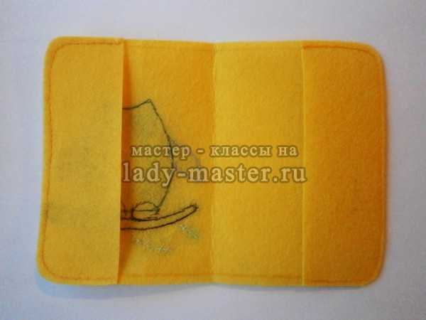 18. Следующий важный этап – это пришивание дополнительных деталей, которые будут фиксировать паспорт внутри обложки. Дополнительные детали пришьем желтыми нитками с изнаночной стороны прямоугольника – справа и слева. Чтобы они не сдвигались, можно приколоть их булавками. Пришивать дополнительные детали нужно так, чтобы обложка располагалась перед глазами лицевой стороной.