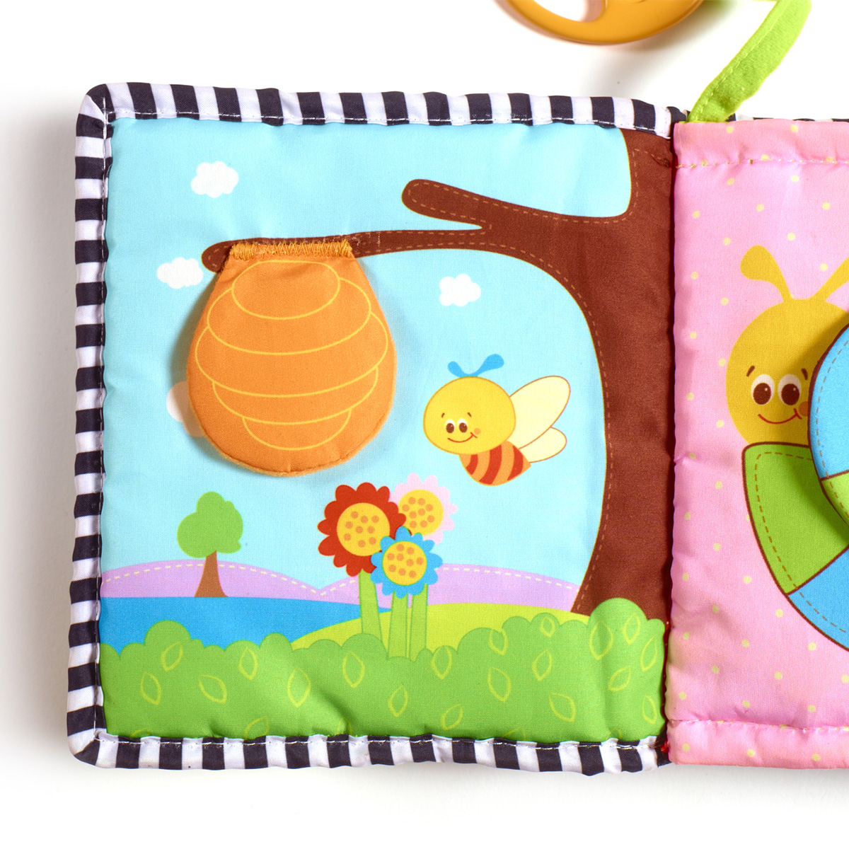 - Книжка со звуками – мягкая книжечка с изображениями животных и кнопками, воспроизводящими звуки их голосов. Игрушка поможет малютке узнать, как говорят коровы, свинки, собачки, кошки. Будет развиваться воображение и память, эмоциональное восприятие;
