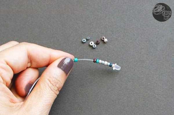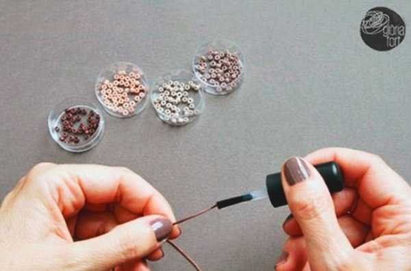 Нанесите лак для ногтей на конец проволоки или лески и дайте ему немного подсохнуть. После этого вам будет намного проще нанизывать бусины на изделие.