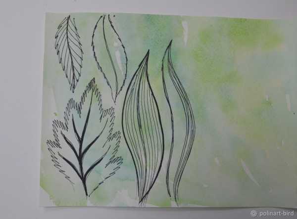 3. Делаем заливку листа зеленым цветом, не боимся добавлять побольше воды, тогда краска растечется эффектнее.