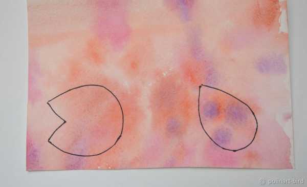 10. Нарисуем тюльпан, состоящий всего из двух деталей. Воспользуйтесь выкройкой. Разместите детали выкройки на самых красивых акварельных пятнах и обведите детали тюльпана.