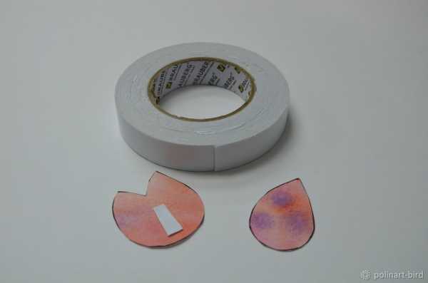 12. Сразу соберем тюльпан. На нижнюю деталь наклеим двусторонний скотч, как показано на фото. На скотч наклеим верхнюю деталь тюльпана. Можно склеить и просто на клей, но с помощью скотча цветок выглядит объёмнее.