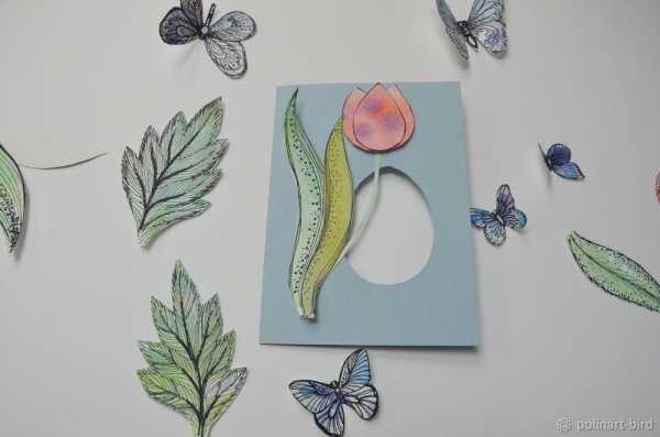 Наша открытка будет состоять из нескольких главных элементов: цветы (тюльпаны), бабочки и листья.