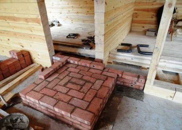 Фундамент для печки — обязателен. Высота зависит от пространства под полом. Заливается только на подготовленное основание. Если это земля — насыпается чистый песок. Укрепляют основание арматурой, обломками камней, ставят опалубку.