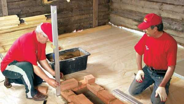 Как именно нужно ставить простую печь из кирпича на пол без фундамента, показано на рис. ниже. Суть, будет полагать, понятна: печи, продолговатые в плане, ставят между опорными столбами так, чтобы лага пола приходилась на продольную ось печи. Печи скорее квадратные в плане и вообще компактные ставят их геометрическим центром на столб.