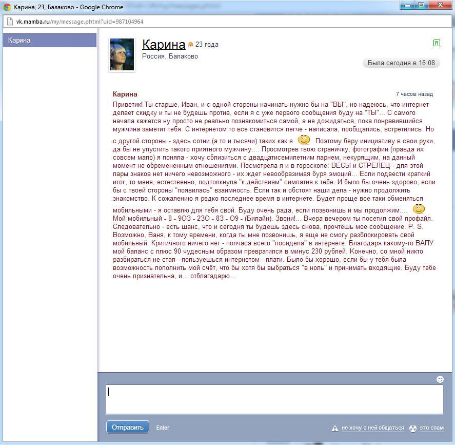 Видишь, как ты можешь отправить эти сообщения любой женщине, которая попадется тебе на глаза?