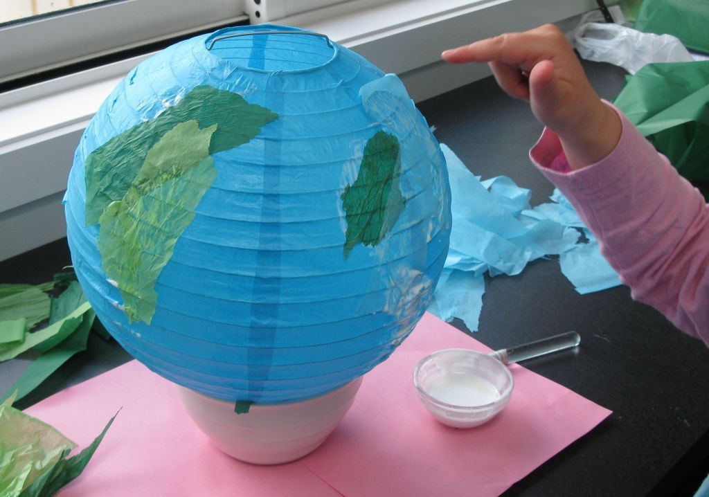 Если совместно со взрослыми (сами малыши такую сложную поделку не осилят) изготовить объемный шар, раскрасить его в голубой цвет, нарисовать на нем зеленые континенты и острова, то дети получат прекрасное, зримое представление о земном шаре.