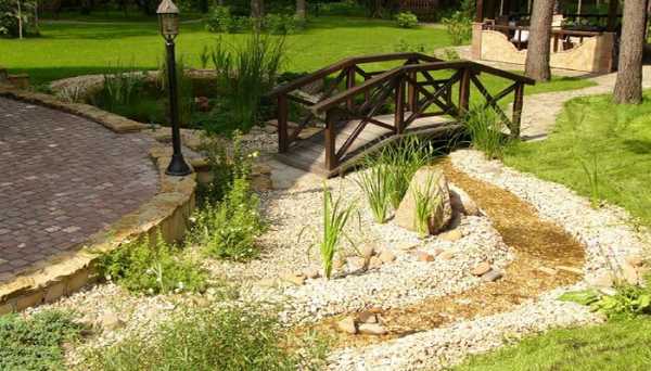 В качестве обязательных атрибутов можно отметить наличие увитой цветами беседки, фонтанчика, фонарей и скамеек под деревьями или арками. Журчащий ручеек по всему участку, прячущийся или начинающийся в искусственном гроте, добавит романтики ландшафту.