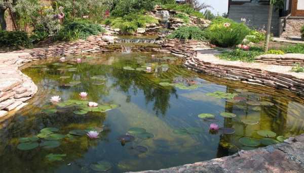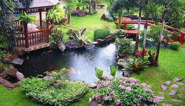 Если же Вы все-таки готовы к крупным размерам, то пруд делайте неправильной формы с мостиками и маленькими тихими заводями, а беседку наполните контейнерными растениями — стоячими и висячими.