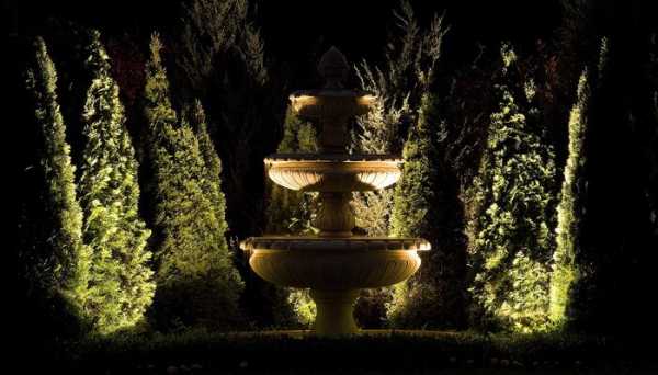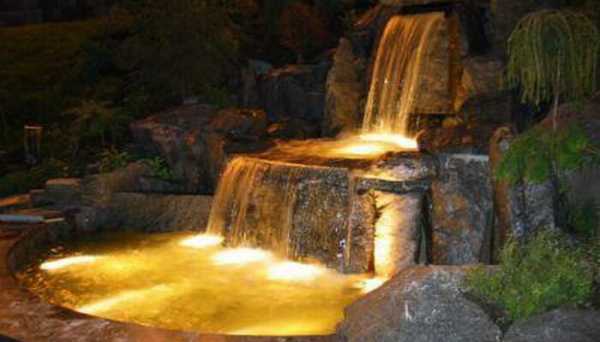 Если вы хотите осветить садовый фонтан или водопад, источник света должен находиться сзади. Поток света направьте так, чтобы струи падающей воды красиво блестели. Подчеркните красивую линию дорожки или площадки цепочкой светильников.