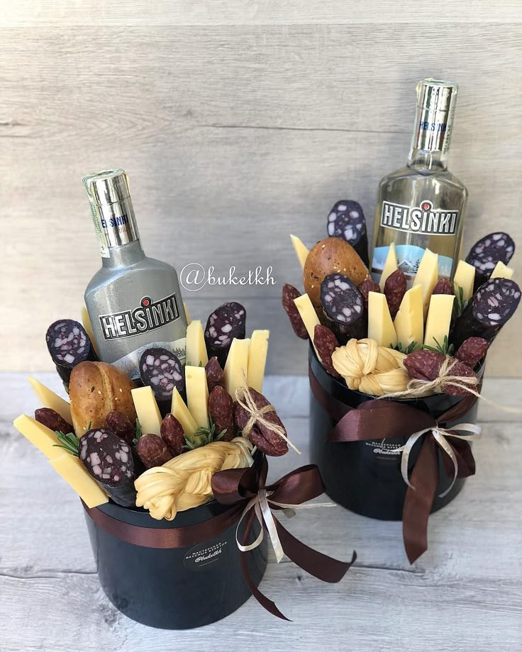 Хоть мы знаем, что многие мужчины воспринимают букеты как бесполезный подарок, но такой вариант букета с колбасой и сыром благодаря его функциональности не оставит никого равнодушным.