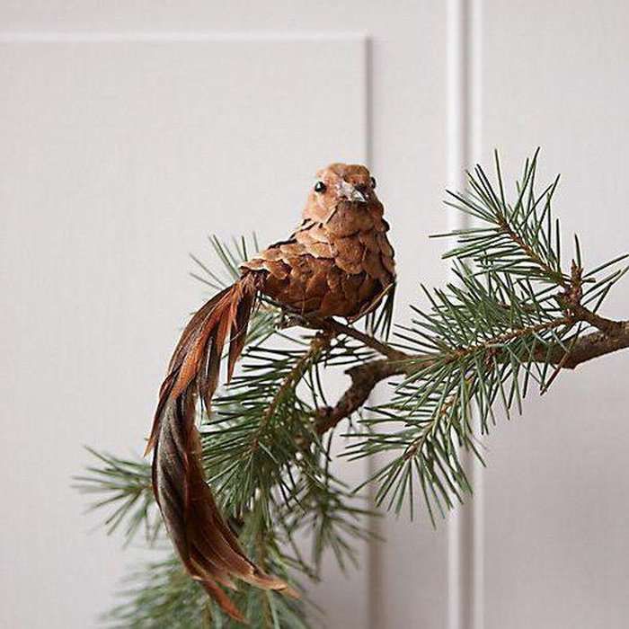 Для того чтобы закончить птицу из шишек, нужно найти длинное коричневое перо курицы или другой птицы, помыть его, просушить и немного согнуть, чтобы был полукруг. Приклеивают его с острого конца. С другой стороны поделки делают голову. Для клюва можно использовать кусок коры или веточки. Глаза — черные маленькие кусочки пластилина или бусинки. Можно такую поделку посадить на новогоднюю елку.
