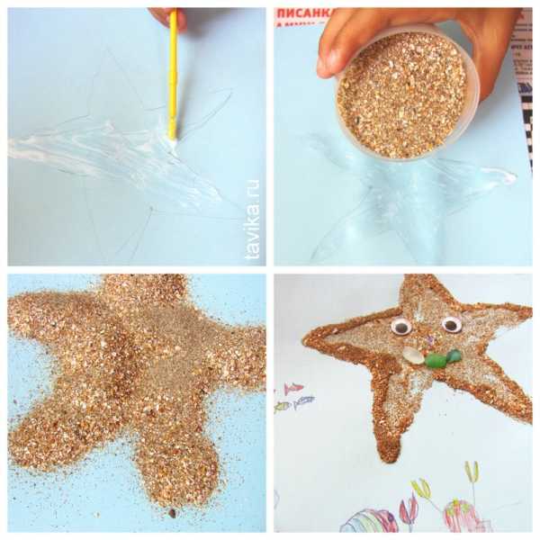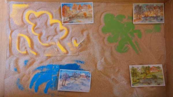 На стекло кладут цветной картон, красочные картинки. Поверх тонким слоем рассыпается песок. Дети рисуют круги, зигзаги. Цветной фрагмент выступает частично. Получается оригинальная картинка.