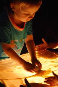 Затем педагог обращает внимание на световой стол, просит обвести пальчиком силуэты «бубликов-баранок» по внешнему краю (3-5 раз), чтобы запомнить движения.