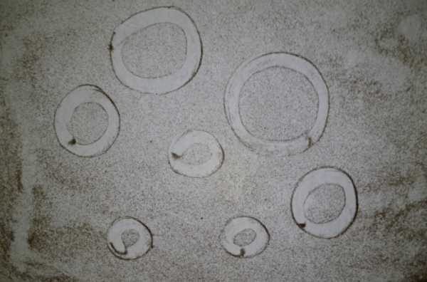 Возьмите штампы, трафареты для кофе, крышки от пластиковых бутылок. Оставляйте ими следы на песочном столе. С помощью разных фигур создаются большие сюжетные композиции.