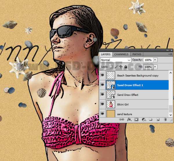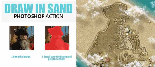 Примечание: Кроме изображений, автор предлагает воспользоваться платным экшеном по созданию рисунка на песке. В качестве альтернативного варианта вы можете воспользоваться «Делаем в Фотошоп надпись на песке» Шаг 10.