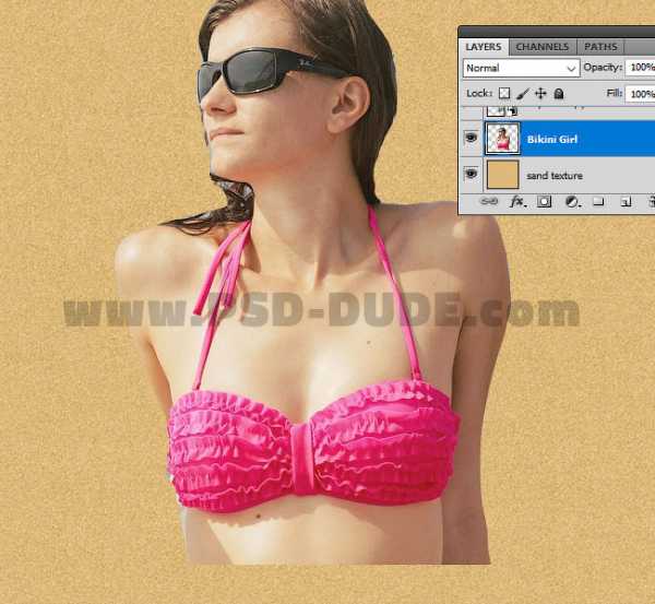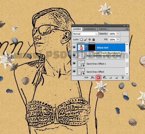 Над слоем с текстурой песка добавляем новый слой и вставляем на него картинку с пляжем. К текстуре применяем маску и черной кисточкой (В) удаляем лишние детали.