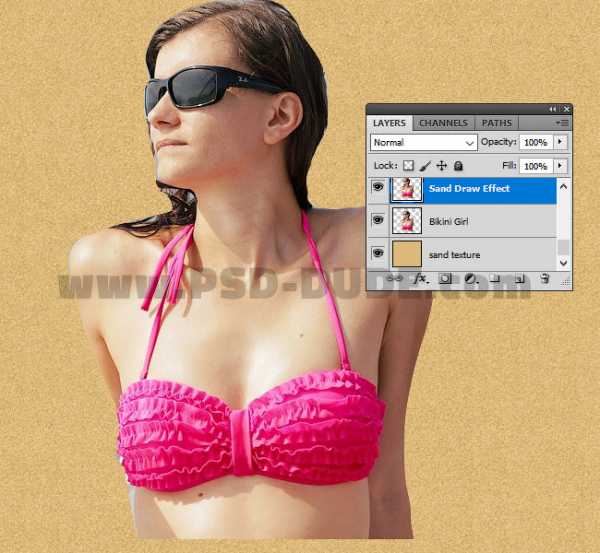 Называем слой с девушкой «Девушка» и дублируем его (Ctrl+J). Переименовываем копию на «Рисунок из песка».