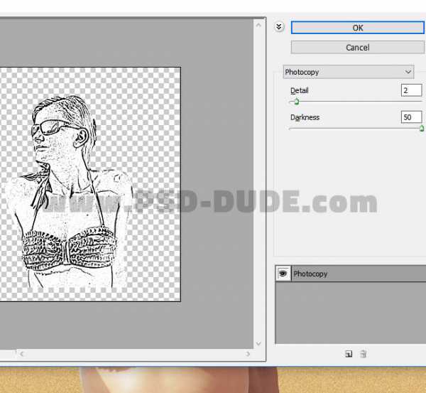 Устанавливаем цвет переднего плана на черный, а заднего – на белый. Переходим Filter – Filter Gallery – Sketch – Photocopy (Фильтр – Галерея фильтров – Эскиз – Ксерокопия).