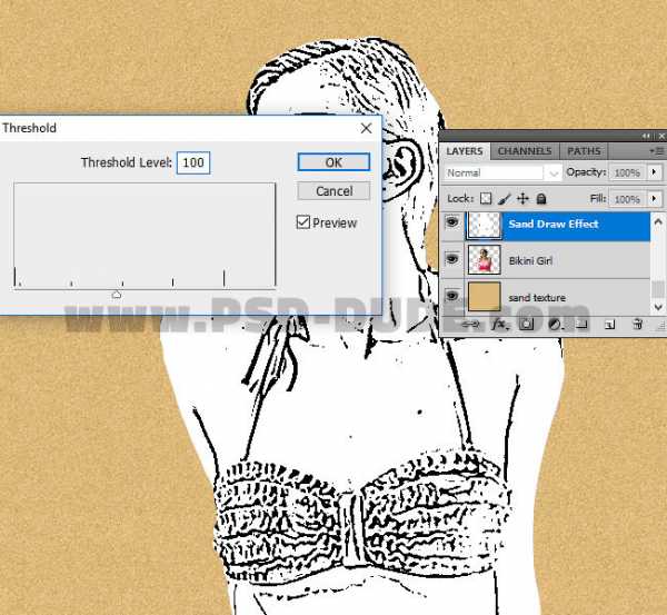 Затем переходим Image – Adjustments – Threshold (Изображение – Коррекция – Порог) и применяем параметры, как показано ниже.