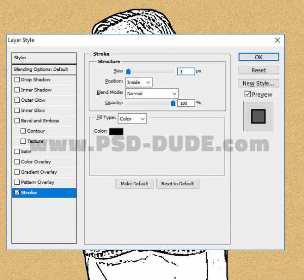 Дважды кликаем по слою с девушкой и добавляем стиль слоя Stroke (Обводка). Size (Размер) устанавливаем на 3 пикселя, Position (Положение) – на Inside (Внутри), черный цвет.
