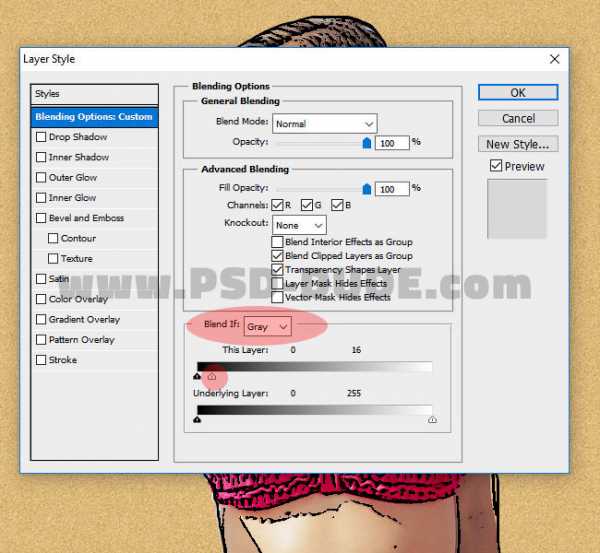 Кликаем правой кнопкой по слою «Рисунок из песка» и выбираем Convert to Smart Object (Преобразовать в смарт-объект). Открываем окно Layer Style (Стиль слоя) и находим параметр Blend If (Наложить если) в нижней части окна. Устанавливаем верхний белый ползунок примерно на 16.