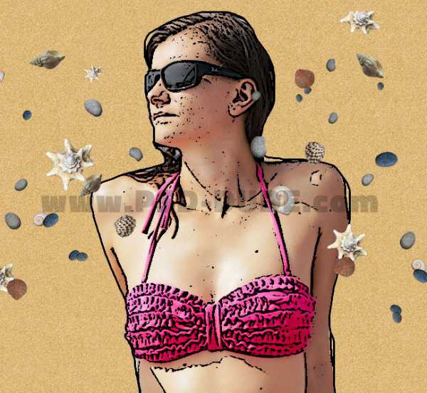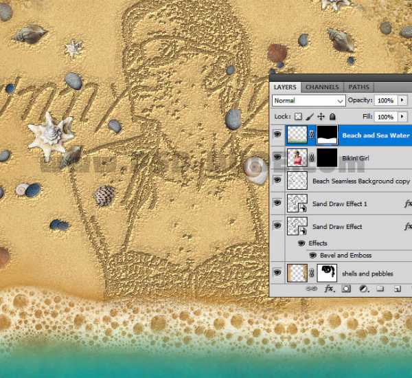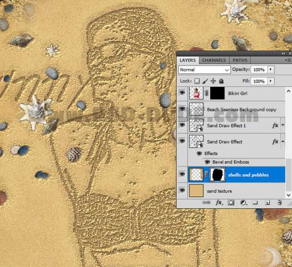Выше создаем новый слой и вставляем на него текстуру с ракушками. С помощью Eraser Tool (E) (Ластик) удаляем камушки и ракушки, которые, по вашему мнению, лишние.