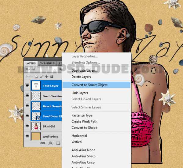 Выбираем слой «Рисунок на песке», одну из копий слоя с ракушками и текстовый слой (при этом удерживаем клавишу Ctrl, чтобы одновременно выделить несколько слоев). Кликаем по выделенным слоям правой кнопкой мышки и выбираем Convert to Smart Object (Преобразовать в смарт-объект). Называем созданный смарт-объект «Эффект рисунка на песке».