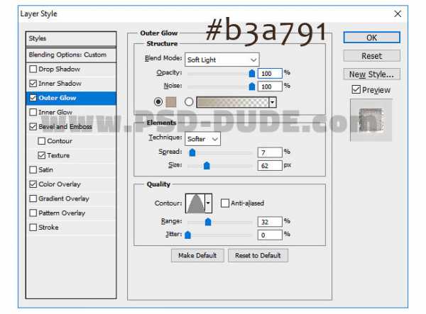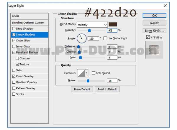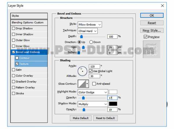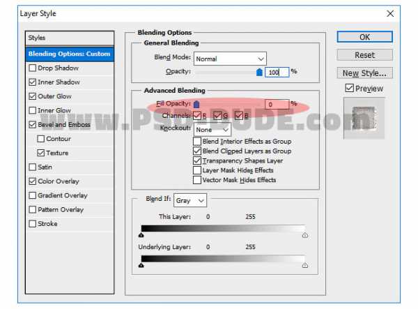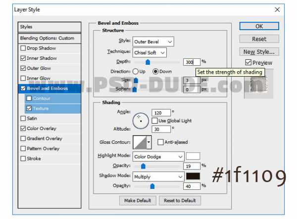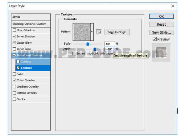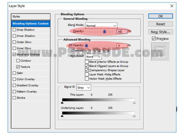 Для слоя «Эффект рисунка на песке» добавляем следующее стили слоя, чтобы сделать результат более реалистичным.