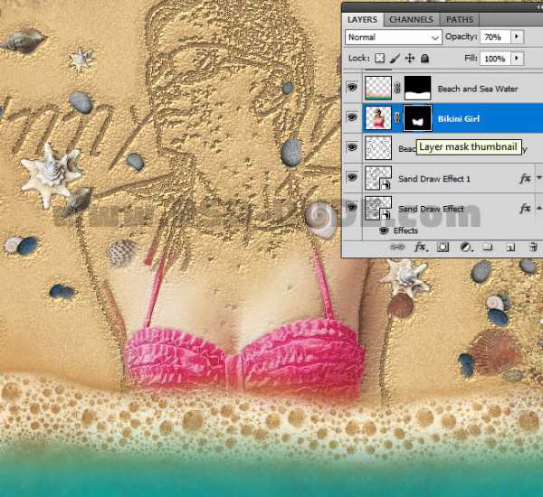 Выше всех предыдущих слоев добавляем еще один новый слой и вставляем на него картинку с песком и морем. Добавляем к слою маску и мягкой круглой кисточкой (В) черного цвета скрываем песок, оставив только воду.