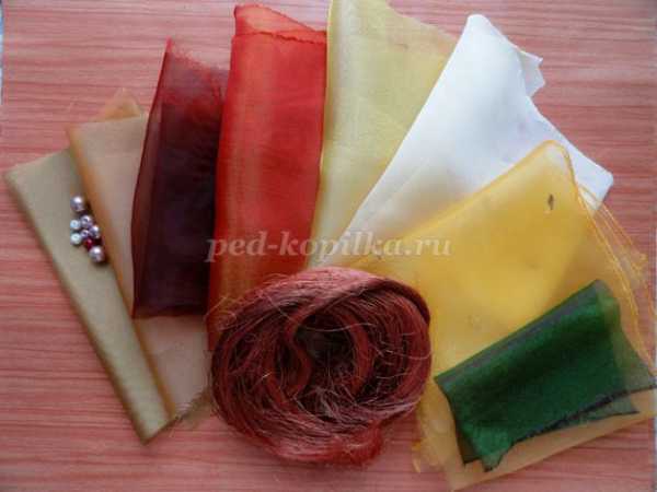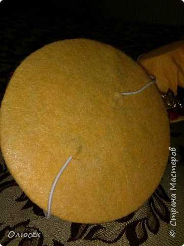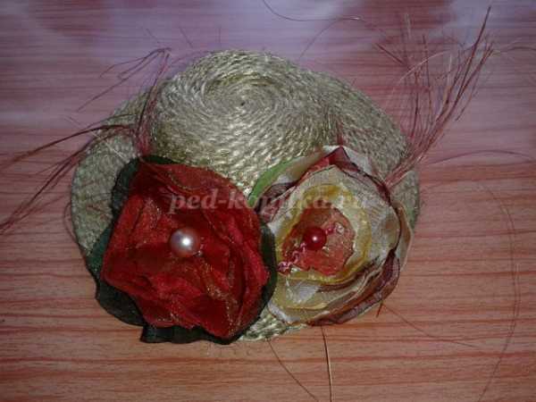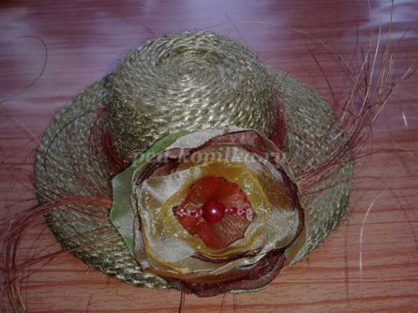 Ткань — вискозная салфетка для уборки. Поля — круг из картона (размер CD диска), тулья — одноразовая пластиковая чашечка. Чтоб хорошо держалась на головке — приклеила круглую резиночку. Для украшения — золотая ленточка, пайетки и бусинка.