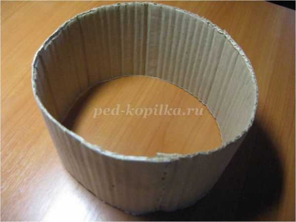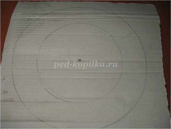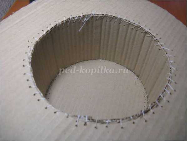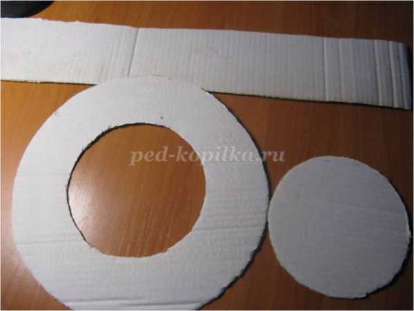 Начнем с того, что возьмем гофрированный картон, вырежем из него круг, измерив диаметр головы. Вырежем уже в круг отверстие. Старайтесь не ошибиться, проверить, померить. Нужно точно.
