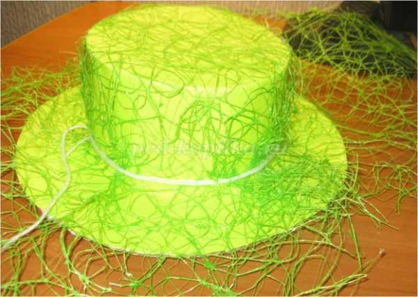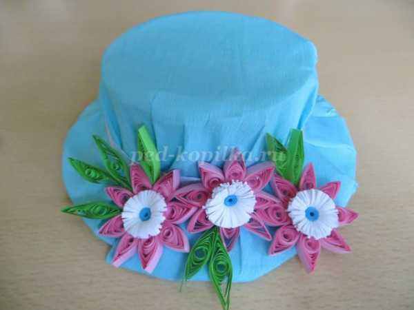 - Продолжаем декорировать шляпу, вырезаем полоску длиной 10 см, складываем, закрепляем на шляпе с помощью клея.