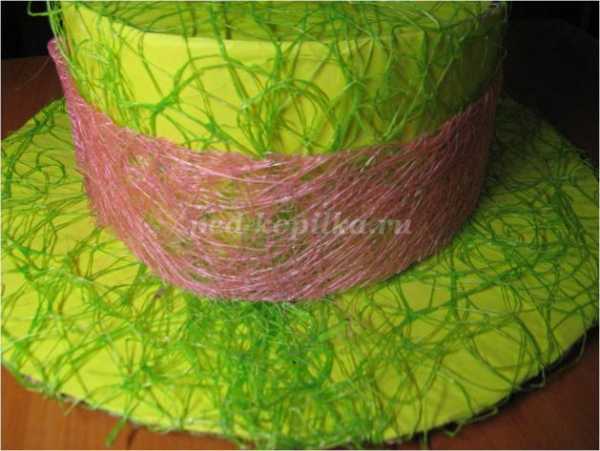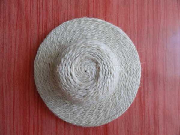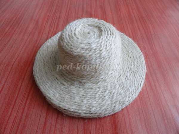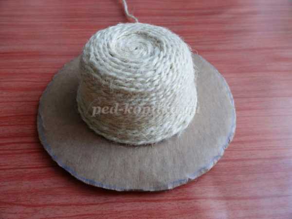Готовим шляпу к декору с помощью веревки. Аккуратно приклеиваем ее по кругу к заготовке.