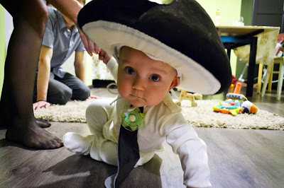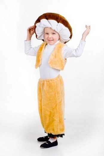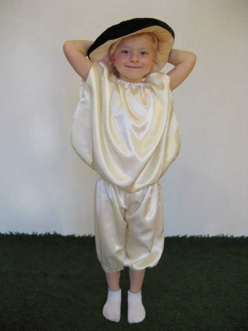 Костюм на ребенке должен походить на ножку гриба, для этого можно надеть комбинезон, или однотонные вещи.