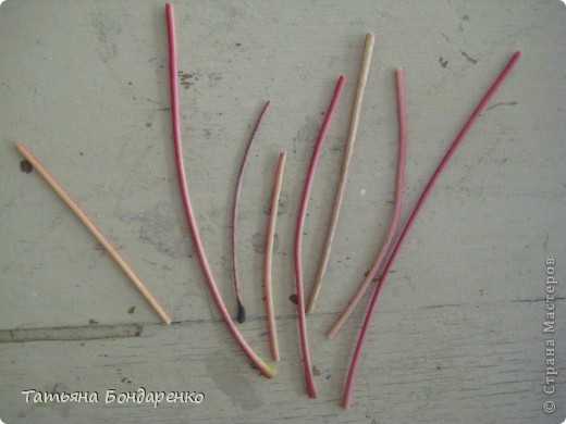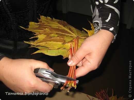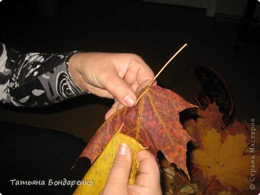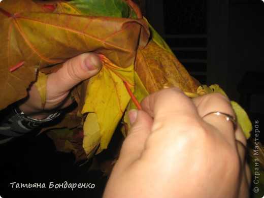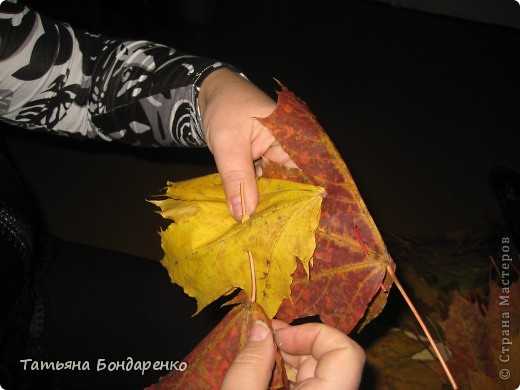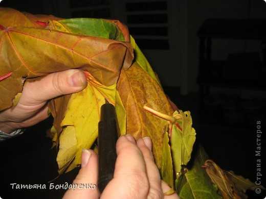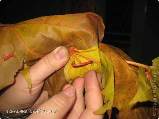 При этом сейчас нужно прокол сделать шилом, т.к. очень толстый слой листьев. В отверстия прокола вставляем заранее приготовленные хвостики от этих же листьев