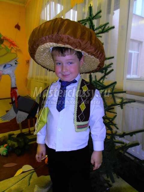 Прикрыла шляпу гриба листиками. Готовый результат перед вами. Малыш будет доволен и красив на утреннике.
