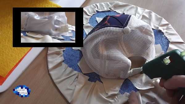 Пришиваем бейсбольную кепку к картону, решите сами для себя, будете ли делать эластичные ленты. Пришили кепку. Заделываем отверстия, чтобы синтепон не вываливался. Для этого решила приклеить из-за отсутствия времени, и быстренько прихватила.