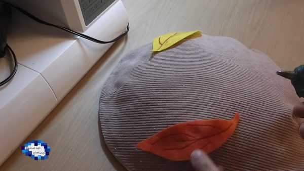 Проклеив или прошив потайным швом, сама шапка гриба уже готова. Приступим уже к украшению. Тема “осень”, подчеркнула осенними листиками, не брав из интернета выкроек, нарисовала один маленький листик, другой большой. Исчезающим маркером нарисовала линии как прожилки на настоящем листике, прошила несколько раз, чтобы они были толстенькие, чтобы можно было разглядеть. Сделав два листика уже закрыв недостатки, швы, которые получились такими не аккуратными.