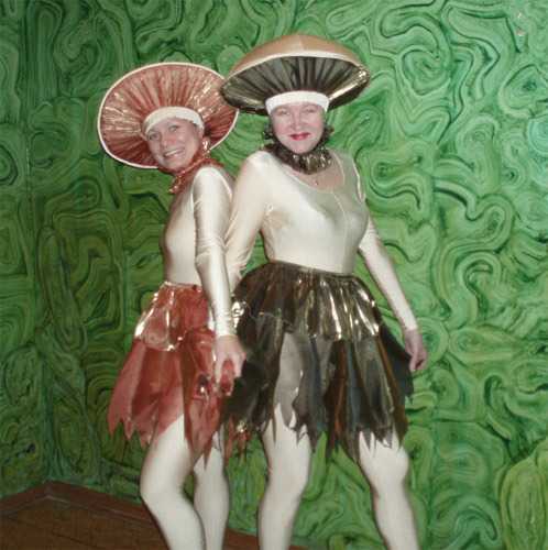 Из плотного фетра (или любой другой ткани) белого цвета отрежьте круг, диаметр которого равен диаметру шляпы. По середине отрезать отверстие для готовы. У мухомору, как мы знаем, есть пластинки. Чтобы соответствовать мухомору, пришейте от центра круга к краям атласные ленты (шов по середине ленты). Затем этот круг приклеить при помощи пистолетного клея к шляпе. В качестве ножки можно использовать любое платье белого цвета с оборочкам (у мухомора есть юбочка).